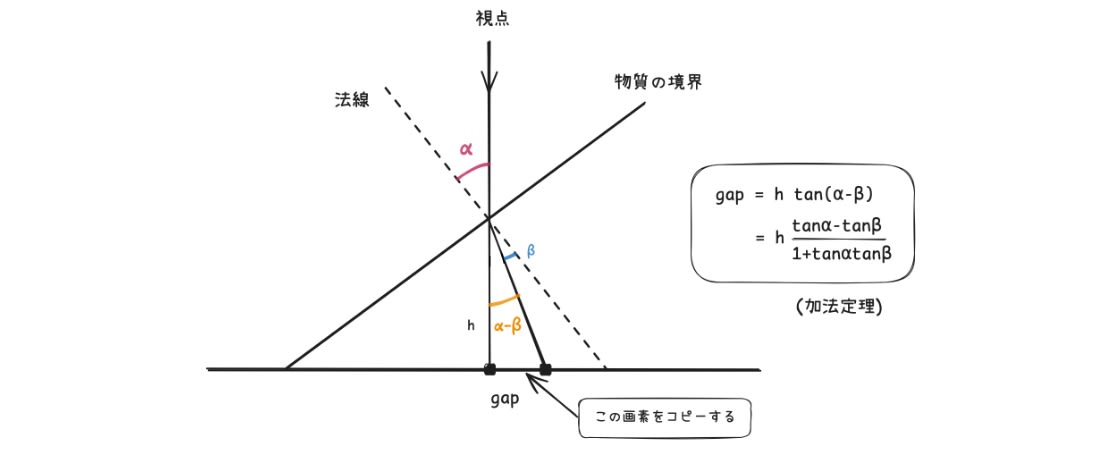 屈折を考慮し、RGBの値をずらすとガラスのような表現が可能になります。ここでは、簡易的に屈折を再現してみます。まずは下図のように法線から角度の視点からみて、角度屈折したgapを求めます。